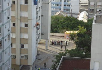 Duas pessoas foram resgatadas de um andaime que ameaçava cair de um prédio na Avenida Independência, 352, em Porto Alegre. A estrutura estava localizada na altura do oitavo andar quando uma das cordas que a prende se rompeu. Duas guarnições do Corpo de Bombeiros atenderam a ocorrência e o Samu também foi chamado.